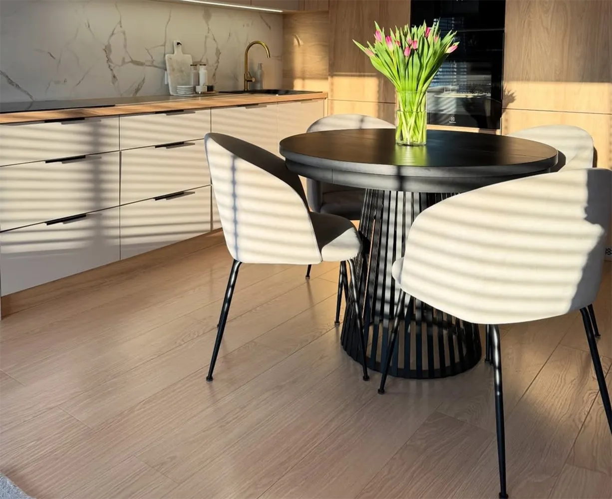 Il pavimento SPC, realizzato in eleganti maxiplance contraddistinte da una finitura naturale, è la scelta ideale per impreziosire gli ambienti domestici, commerciali o produttivi con un tocco caldo e accogliente e dare vita a sofisticate soluzioni di design basate su abbinamenti classici, con arredi di colore chiaro e luminoso, o più audaci, con pareti scure a contrasto.